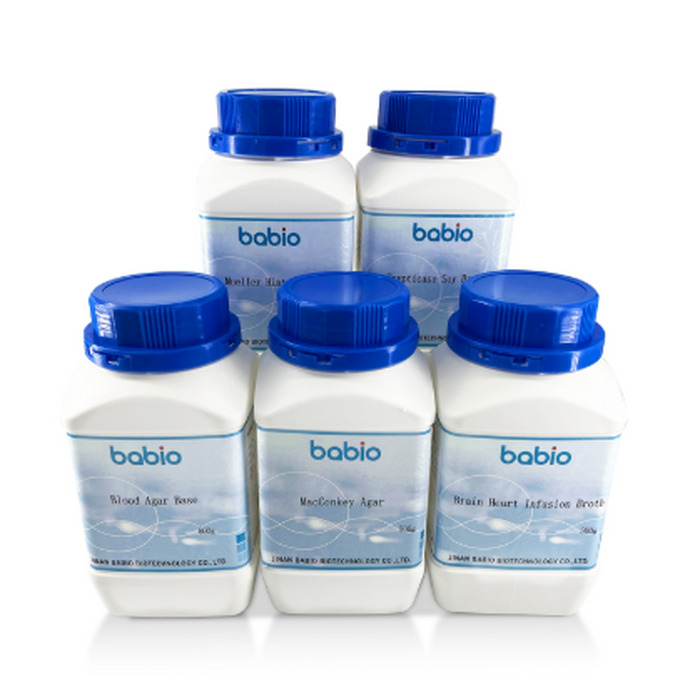 Meio de cultura desidratado Ágar TSC em pó, utilizado para o isolamento seletivo e enumeração de Clostridium perfringens em amostras de ensaios microbiológicos, marca Babio, acondicionados em frascos com 500g cada.