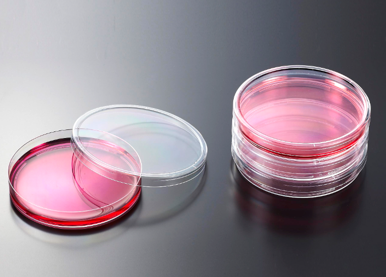 Placa de pétri descartável, fabricada em poliestireno, com tampa, estéril por feixe de elétrons, com base e tampa.